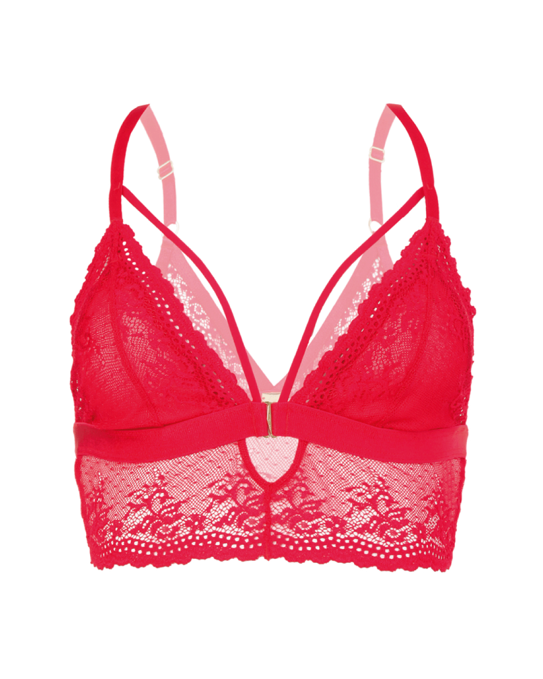 Bralette en encaje y malla de copa triangular, detalle de tiras en el escote y zeta frontal. Cargaderas graduables.